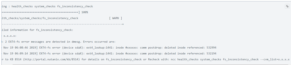 1. The NCC health check fs_inconsistency_check verifies whether any CVM (Controller VM) in the cluster is experiencing filesystem inconsistencies by checking for EXT4-fs error/warning messages in dmesg and scanning tune2fs output for all mounted disks.