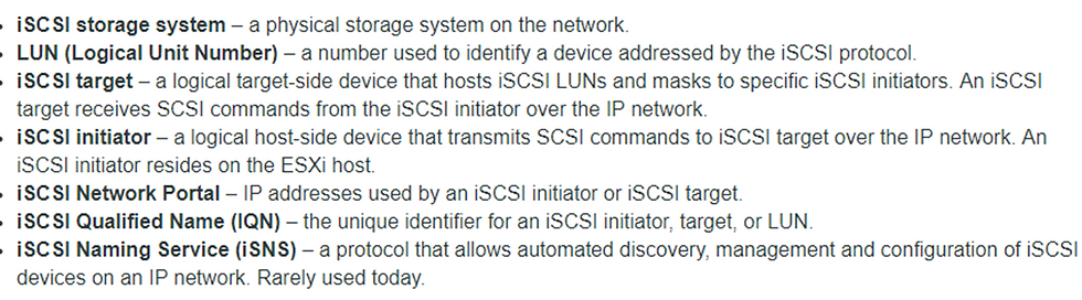 Internet SCSI (iSCSI) is a SAN transport that can use Ethernet connections between ESXi hosts and storage systems. To connect to the storage systems, your hosts use hardware iSCSI adapters or software iSCSI initiators with standard network adapters