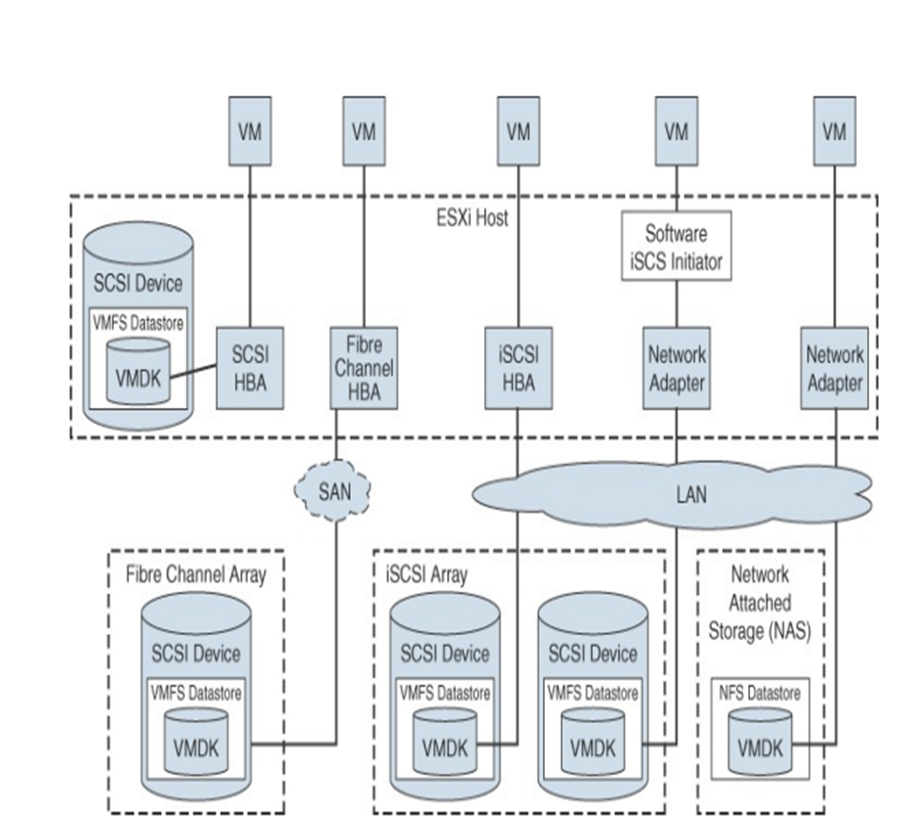 Local Storage : Local storage can be internal hard disks located inside an ESXi host and external storage systems connected to the host directly through protocols such as SAS or SATA. Local storage does not require a storage network to communicate with the host.